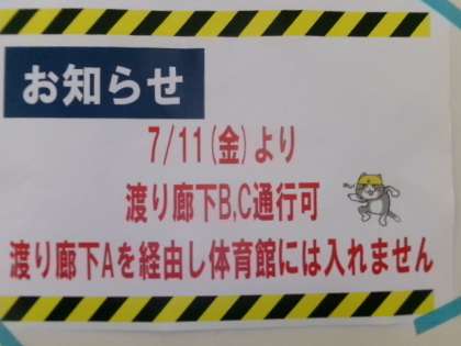 7月11日(金)より、体育館へ渡る東側通路が工事のため通行不可となりました。ご協力をよろしくお願いします。