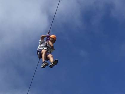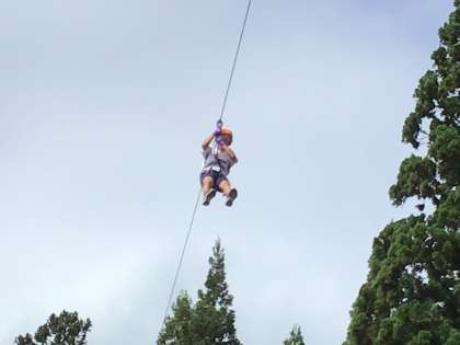 1日目4か所に分かれてのアクティビティ体験です。写真はハーネスをつけてジップライン体験です。