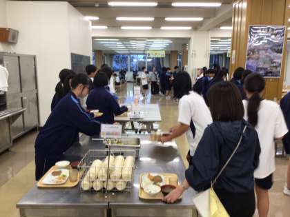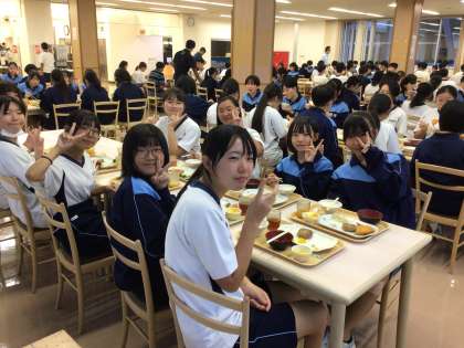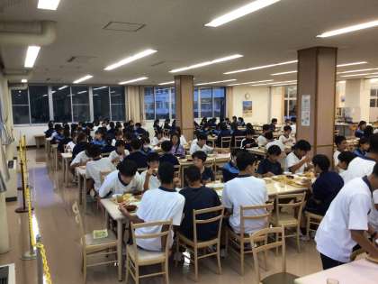 ハンバーグとアジフライの美味しい夕食をいただきました。18時半から体育館で学年の集いです。