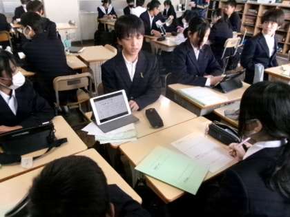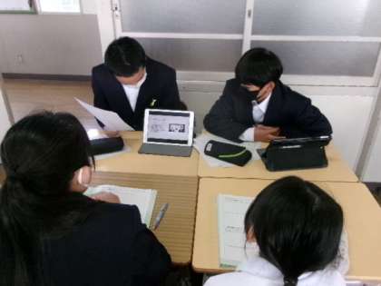 1・2年生で4〜5人の異学年班を作り、総合的な学習や自然教室で学んだことを、2年生一人一人がパワーポイントにまとめ、1年生に発表しました。