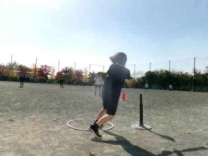 11月14日(金)2年生が運動場で、歓声を上げて「ベースボール(ティボール)」をしていました。とても気落ちのよい天気ですね。