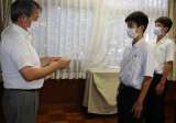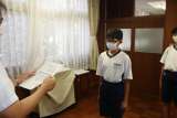 全校生徒の代表として、生徒会役員となった8名の生徒に校長先生から認証状が渡され...