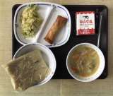 今日の献立は、中華麺、豚骨ラーメン、中華サラダ、春巻き、コーヒー牛乳の素、牛乳、...