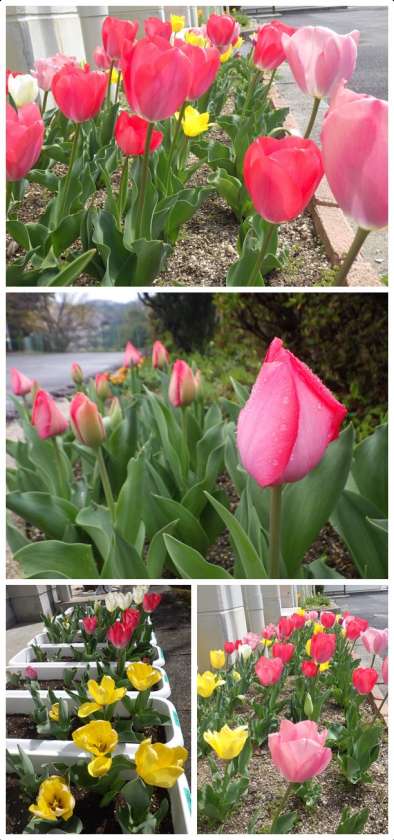本校では現在、至るところで色とりどりのチューリップを見ることができます。
