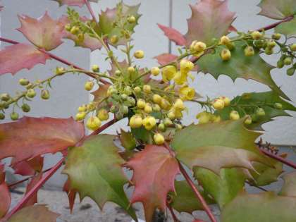 校舎の西側にひっそりと植わっているヒイラギナンテン(柊南天)。秋になると紅葉してとても綺麗ですが、この時期には黄色い小さな花をつけていきます。最近ではその兆しが見えてきました。