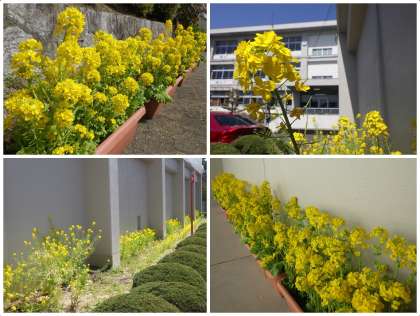本校の至る場所で咲く菜の花。今日のような天気のよい日には、ひときわ黄色の花の色が鮮やかさを増します。
