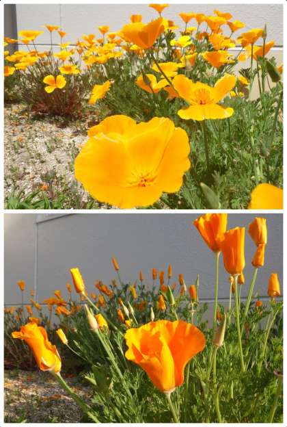 体育館南側の花壇で育つハナビシソウ(花菱草)。花びらにつやがあり、鮮やかなオレンジ色の花びらに日が当たってキラキラと咲いている姿は、とても目を引きます。