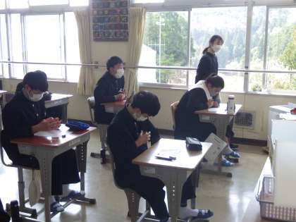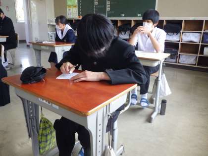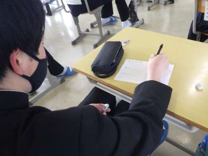 年度初めの段取りを知り尽くした3年生は、「決意表明」なるものを書いていました。中学校生活(義務教育)最後の一年と考えると、これまでの目標づくりとはひと味違ったものに感じているようです。一年後の自分を想像しながら、一生懸命考えていました。