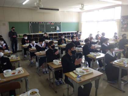 一方1年生は、小学校の時よりも人数が増え、配膳などの仕方も若干変わったため、ずいぶん苦戦していました。配膳が終了したのは、「ごちそうさま」の予定時刻の10分を切っていました。「いただきます」のあいさつが終わった瞬間、猛烈にごはんを書き込む男子生徒。たくましさを感じました。
