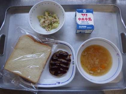 今日の献立は、オニオンスープ、ツナサラダ、ハンバーグサンド、スライスパン、牛乳 でした。  エネルギー:792kcal