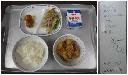 今日の献立は、肉じゃが、ゆかりあえ、ごぼう入りつくね、ごはん、牛乳 でした。  エネルギー:767kcal