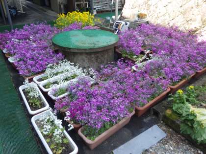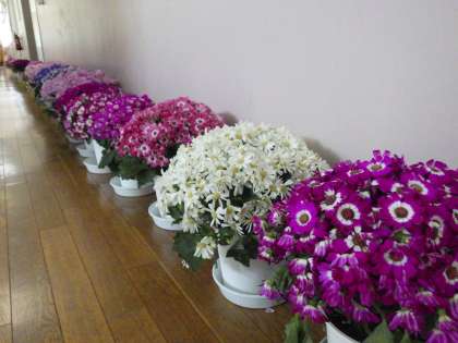 入学式・始業式で会場を彩った花たち。玄関には花瓶にきれいに生け直されました。また、多くのサクラソウやサイネリアは、違った形での出番を待っています。