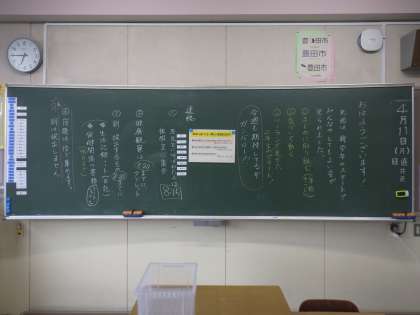 黒板には学年主任からたくさんのメッセージが書かれています。先週の頑張り、今週への期待、そして週明けから積極的に活動できるようにと様々な連絡…。