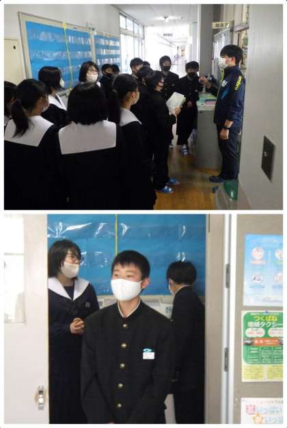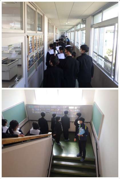 1年生の学活の様子です。全教科の学力テストと知能テストが終わり、校内の巡回を行っていました。これから始まる授業において、特別教室の位置や教科委員としての職員室の鍵の借り方などを身に付けていきます。