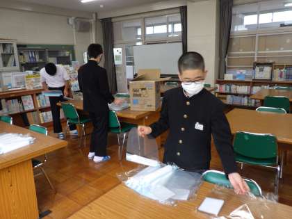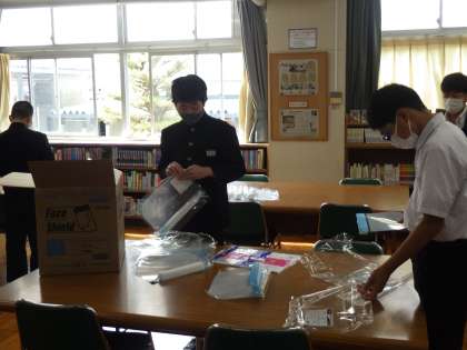教科担任の「仲間が喜ぶ行動は?」の問いに対して、「仲間がしてほしいと思うことに気づく」と答えた生徒たち。そこで、今後全校生徒に配付される新しいフェイスシールドの仕分け作業を行っていました。
