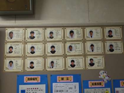 朝、3年生の教室をのぞいてみると、掲示物が少しずつ出来上がっています。写真は、個々の顔写真が載った係や委員会、意気込みなどが紹介されたカードです。