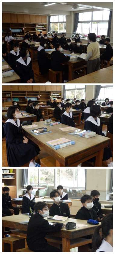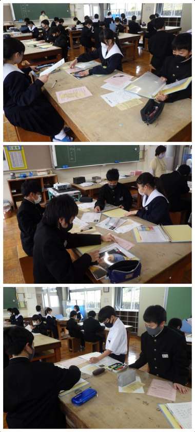今日は初回ということで、授業の流れや道具の扱い・管理についての説明がされていました。これから3年間使用するファイルに名前を書き、配付された学習資料のプリントを閉じていきます。