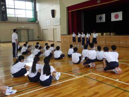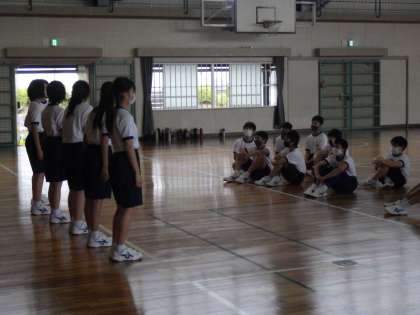 初めての中学校の体育の授業ということで、集団行動を学んでいました。グループに分かれ、代表が号令をかけ、全員で動きを合わせていきます。