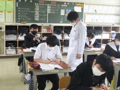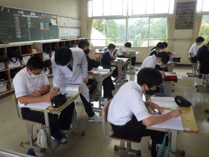 3年生の理科の授業の様子です。「力の分解」について作図の方法を学んでいました。いきなり本格的な授業の内容に、初めは驚いていたようでしたが、多くの生徒が「これが3年生の勉強か…」と感じて、気持ちを切り替えて取り組んでいるようでした。