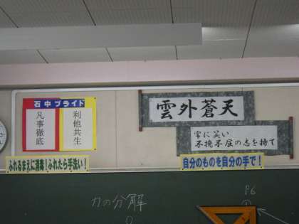 3年生の教室の前面をよく見てみると、きれいに作られた級訓が掲示されていました。また横には、今年度の学校スローガンも掲示されており、生徒たちの意識が継続し、充実した学校生活になるよう願いが込められています。