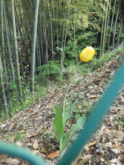 本校のプールの東側は、うっそうと茂った竹藪が広がっています。危険な場所のため、仕切りの境界はフェンスで囲まれています。そのフェンスの外側に、1本だけチューリップが花を咲かせていました。