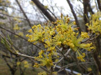 写真は、その中の一つ山茱萸です。難しい名前である「さんしゅゆ」は、中国名「山茱萸」の音読みから来ています。“茱萸”はグミのことで、秋にはグミのような実がなります。赤く熟し、食べられるらしいですが、校内のものは観賞用にしてほしいと思います。