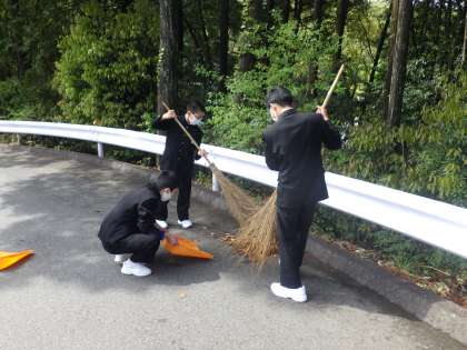毎日の落ち葉で大変なことになっているあいさつの坂道。「生徒だけでなく、お客さんも通る場所だから」ということで、掃き掃除を行ってくれていました。