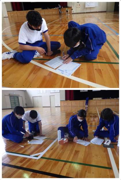 体力テストの種目をひと通り終え、集計表に各種目の記録を書き込んだあと、集団行動の学習に移っていました。
