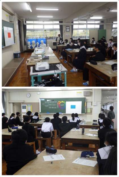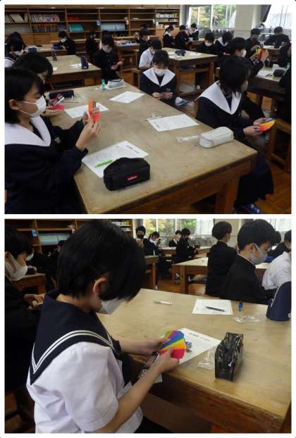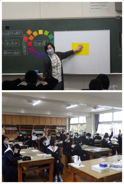 色彩の基礎基本について学んでいました。色相環から色の順序には意味のあることを学習しました。また、補色の関係にある色の実験を行っていました。赤色をじっと眺めていると、水色が浮かび上がり、黄色を眺めていると紫が浮かび上がるといった残像の効果に、生徒たちも歓声をあげて体験していました。