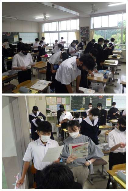 今日はリーディング中心の授業でした。教科担任の後に読むリピートを数回繰り返した後、各自でも数回読んだら座る指示が出ていました。何度もリーディングを繰り返し、英文の暗記・定着を図っていきます。