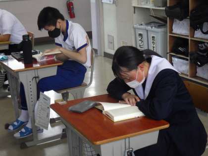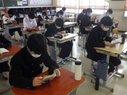 3年生の朝の活動の様子です。体育の小テストを短時間で済ませ、落ち着いて読書を行っていました。
