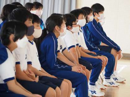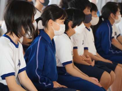 1年生の入場後は、中学校の紹介ということで、3年間の行事や部活動などの紹介が映像を使って行われました。真剣に見ている様子から、これから始まる中学校生活に期待を寄せているようでした。