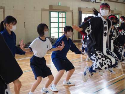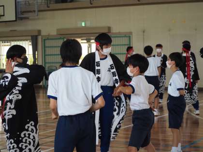 ソーランを披露したあとは、いよいよ1年生への指導の開始です。先輩たちのカッコいい姿を見て、その姿に追いつこうと一生懸命練習しています。また、先輩としてのプライドを発揮するため、熱心に教えています。