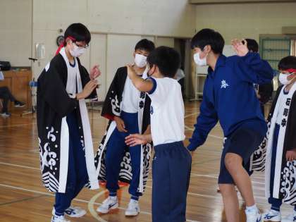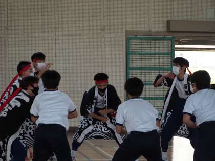 ソーランを披露したあとは、いよいよ1年生への指導の開始です。先輩たちのカッコいい姿を見て、その姿に追いつこうと一生懸命練習しています。また、先輩としてのプライドを発揮するため、熱心に教えています。