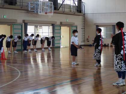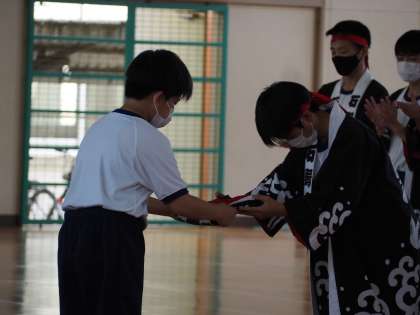先輩たちによるソーラン指導を終え、いよいよ番長から1年代表生徒にバンテンが渡されました。これで完全に石中生としての仲間入りを遂げました。