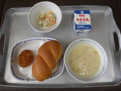 今日の献立は、春キャベツのポタージュ、ビーンズマセドアン、ミンチカツ、ツイストパン、牛乳 でした。 エネルギー:874kcal