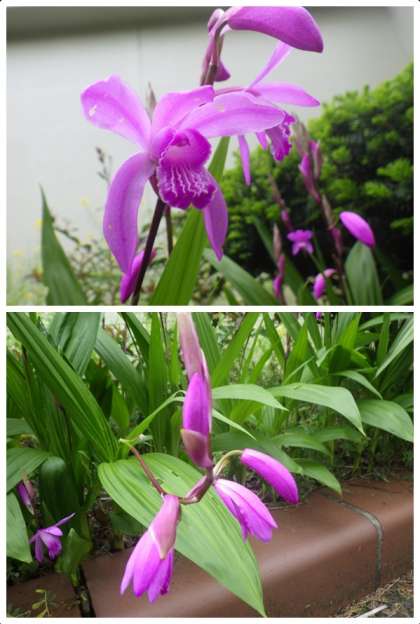 体育館の西側の花壇の一角に咲くシラン(紫蘭)。紫色の花が周りの緑の中でとても鮮やかで、一段ときれいに見えます。