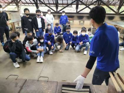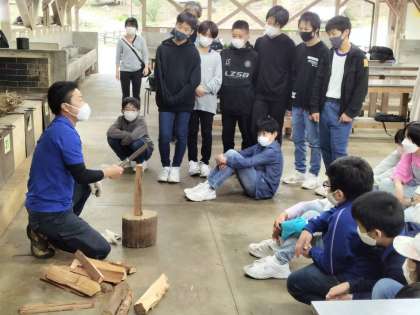 昼食を終えた1年生は、午後の活動の「焼き板パネルづくり」と「野外炊飯」を