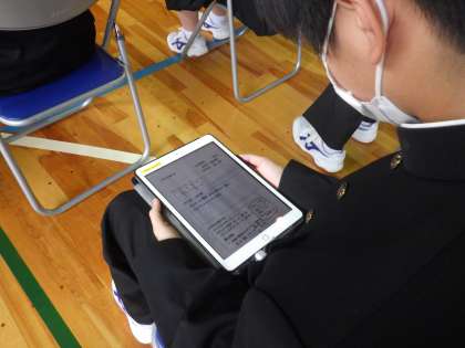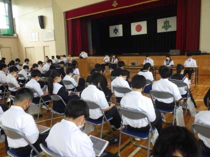 要項はプリントにせず、事前に個人のタブレットの送信されています。しっかり読み込んでいるため、学年を問わず、質問やアイデアなどの提案もたくん出され、有意義な意見交換会になりました。また、本日欠席した生徒もオンラインでの参加しています。