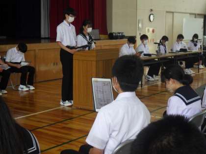 各委員会より前期の活動内容が発表されていきます。守らなければならないルールの確認や学校生活をより快適なものにするための取組など、各委員会でしっかりと話し合い、今日の会を迎えました。