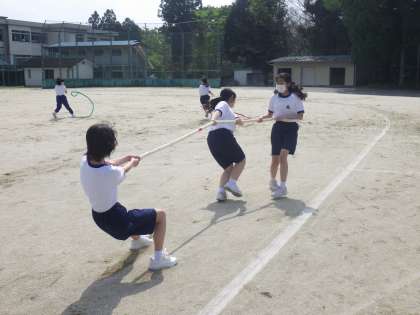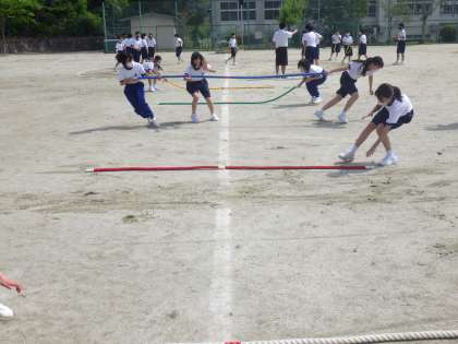 石中OPに向けての種目練習が始まりました。まずは中学校でどんな競技種目があるかの体験です。昨日、宿泊学習から帰ってきたばかりなのに元気いっぱいです。特に女子種目の「綱取り」は、体験の域を越え、すでに激しい戦いが始まっていました。