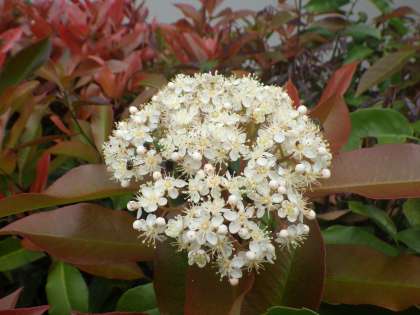 春先、葉が真っ赤に色づき、他の草木とは違った雰囲気になるカナメモチ。葉を赤く染めた次は、白い花を咲かせています。
