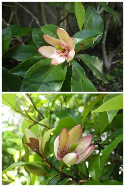 カラタネオガタマは中国原産の常緑小高木です。開花するとバナナのような香りがするので、バナナブッシュあるいはバナナツリーの別名があります。実際はバナナよりももっと爽やかで甘い、梨のような香りです。モクレン科の樹木なので、花もモクレンに似た花を咲かせます。カラタネオガタマの花は直径3センチ程度で、開ききっていないかのような咲き方をします。