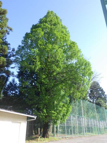 運動場の西側にそびえるメタセコイヤです。緑の葉をたくさんつけ、晴れの日に見るとその大きさと鮮やかさは圧巻です。