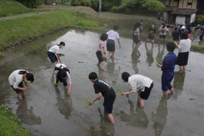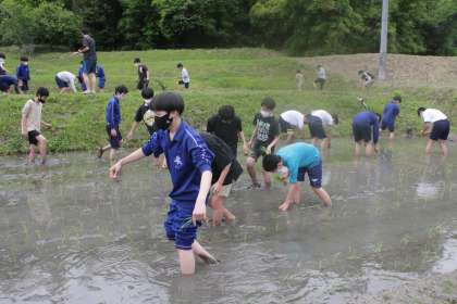 本日の1・2時間目に行われた全校田植えの様子です。
