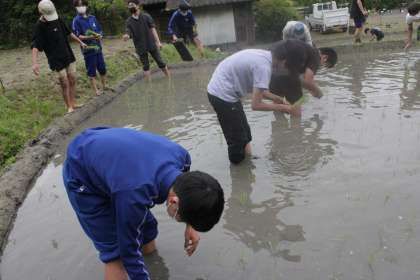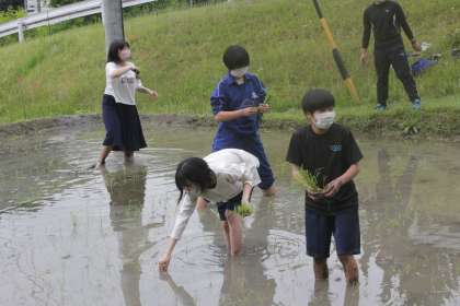 いよいよ作業の始まりです。縦割りのグループに分かれ、それぞれ任された田に苗を植えていきます。3年生が中心となり、段取りよく作業の指示を出し、1・2年生もそれにしっかり応えて活動しています。