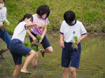 いよいよ作業の始まりです。縦割りのグループに分かれ、それぞれ任された田に苗を植えていきます。3年生が中心となり、段取りよく作業の指示を出し、1・2年生もそれにしっかり応えて活動しています。