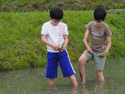 いよいよ作業の始まりです。縦割りのグループに分かれ、それぞれ任された田に苗を植えていきます。3年生が中心となり、段取りよく作業の指示を出し、1・2年生もそれにしっかり応えて活動しています。