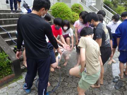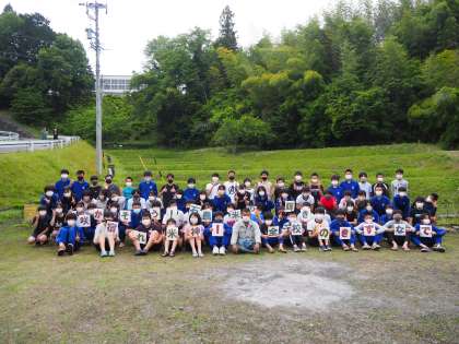 米づくりのお師匠さんと全校生徒で記念撮影です。これまでのお師匠さんの準備に感謝しつつ、今年の田植えを終えました。