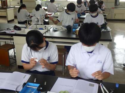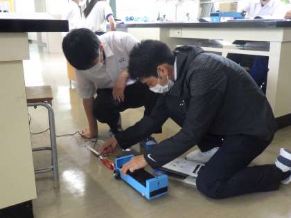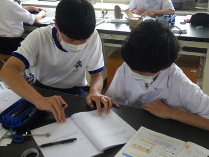 力と運動について学んでいました。記録タイマーを使っての実験をもとにその法則を学んでいました。ペアを作っての協力しての活動です。実験の手順、手際、結果のまとめ方など、それぞれが試行錯誤を繰り返し行っていました。